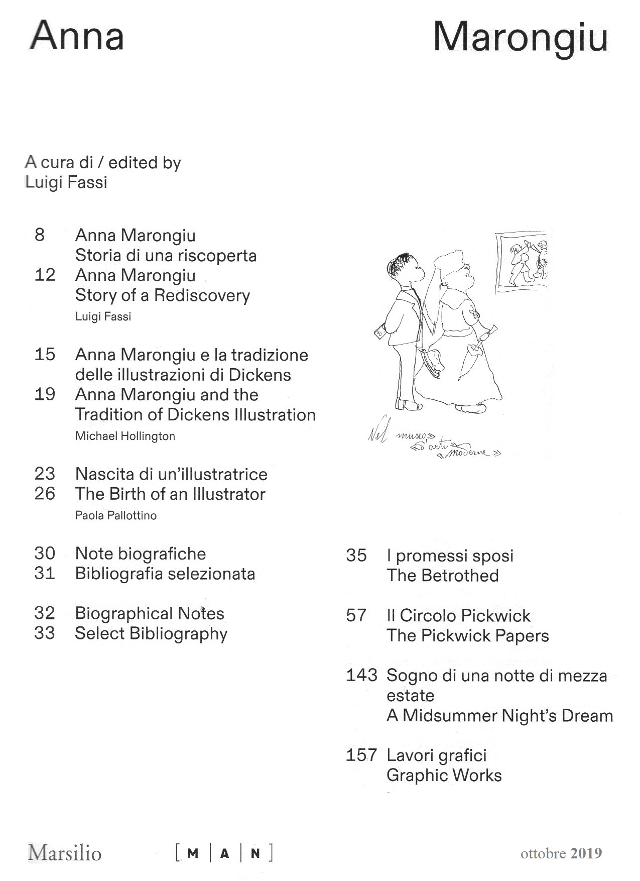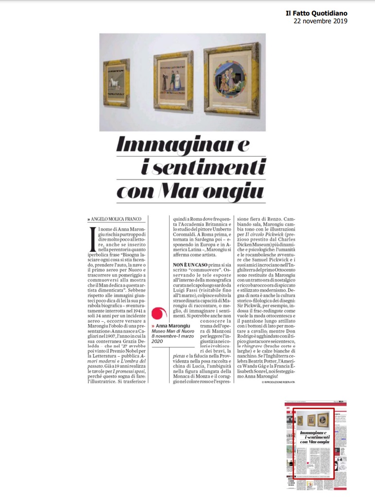 Dopo i primi disegni dell'adolescenza, è nell' illustrazione che Anna Marongiu si cimenta con successo. Le letture da lei amate fanno pullulare nella sua fantasia una quantità indicibile di figure e di scene, cui sente il bisogno di dare segno, forma e, spesso, colore. Questa particolare sensibilità per l'illustrazione, caratterizzata da molta originalità e varietà compositiva, l'accompagnerà in tutto l'arco della sua esistenza. Tra le altre i Promessi Sposi, Il circolo Pickwick e il Sogno di una notte di mezza estate.